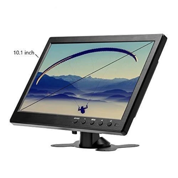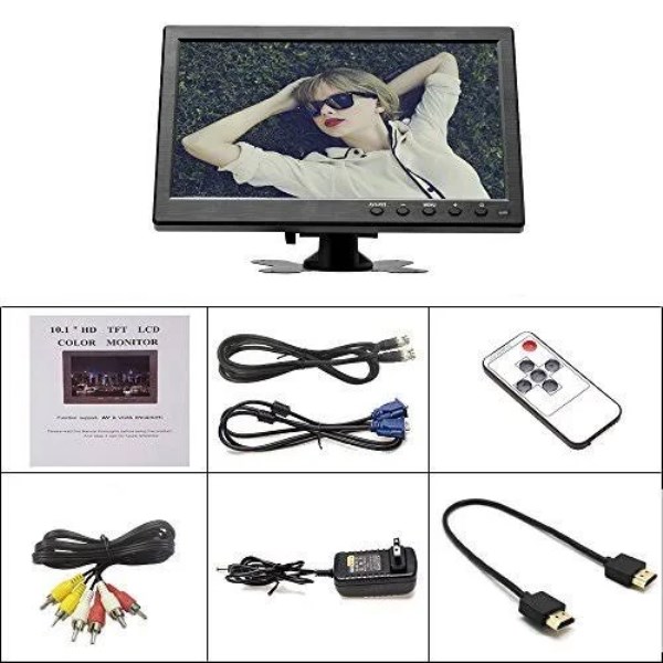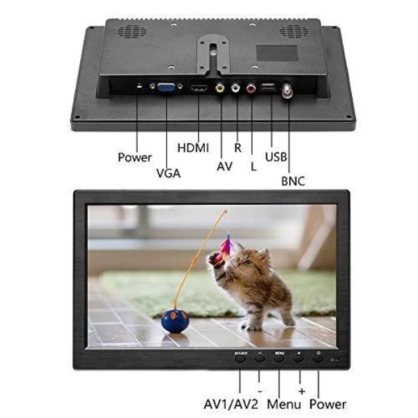 10.1 Inch Small Monitor: high resolution 1024*600 RGB, Aspect ratio 16:9. With NTSC / PAL video color system. Brightness and Contrast can be adjust Video Player Screen: there are HDMI, AV, VGA, BNC, USB input, compatible with cctv security system, car monitor, backup camera system, it is suitable for gaming, computer and so on Mini TV: 2 video inputs, easily switch between front and back video if you use it for car backup system. Automatically switch to backup camera picture when car backup Easy to install: adjustable stand and portable size, allow you to enjoy the film or play games at home or during travel. VGA / AV / HDMI cables accessaries included, kindly note: HDMI version is 1.1 Portable Monitor: The stand is perfect allowing you to adjust the viewing angle and rotate the screen to meet all your needs. Portable to carry so that you can enjoy your favorite shows at home, on car or during travel. There are four holes on the back of the monitor, so that you can hang it on the wall as a TV. (screws not included). Kindly note: /b br If you use monitor for video games, be control AC adapter using time. br This product has 4 kinds of input mode (HDMI, VGA, AV1, AV2), or a cable connection, press the AV1 / AV2 button, Switching input mode and a corresponding mode. br To protect the screen, it is best not to peel off the protective film or change a new protect film. Because there is no influence on the use of the product. br USB Port: Support 5V cellphone charging br br 10.1 inch Mini PC Display & Car backup Monitor & Home Security Screen /b br Maximum resolution supported: 1024X600 br Brightness: 400 cd br Contrast: 500: 1 br Aspect ratio: 16: 9 br Response time: 5ms br Viewing angle: 85/85(left/right),85/85(up/down) br Video color system: PAL-4.43; NTSC-3.58 br HDMI support format: 480i(60Hz),480p(60Hz),576i(50Hz),576p(50Hz),720p(50/60Hz) br Main Product Dimensions: 165x 250x 35mm (L x W x D) br NTSC / PAL video color system, brightness,contrast,color br Supply voltage: DC7.9V to 13.5V br Power consumption: up to 8W br Standby current: up to 35 mA br Operating temperature: -20 to 50 degrees Celsius br Storage temperature: -30 to 65 degrees Celsius br Ports: VGA, BNC, USB, HDMI, AV input, DC 12V br Languages: English, French, Italian, Spanish, German, Chinese, br br What you get? /b br 1 x 10.1 inch LCD Monitor br 1 x Power cable br 1 x HDMI cable br 1 x VGA cable br 1 x AV Cable br 1 x AC Adapter br 1 x Remote Control