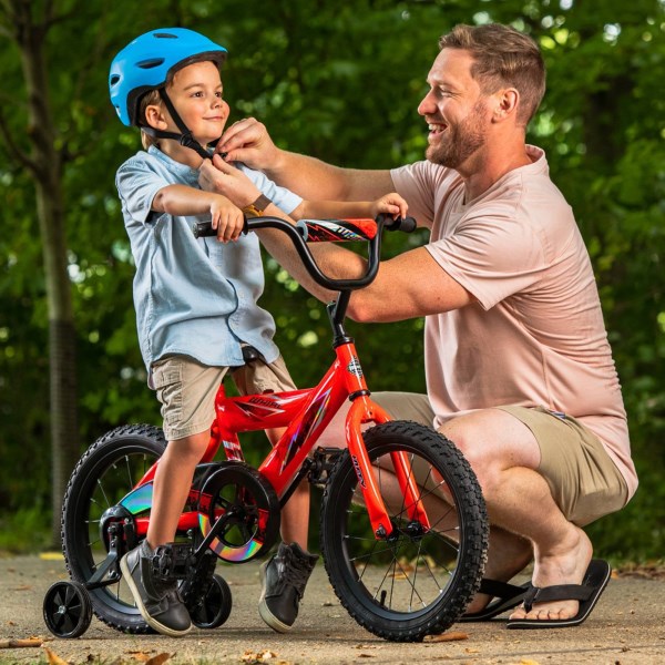 New and only at Target! The Huffy 16′′ Whirl single-speed bike is fully decorated – a durable steel frame, a doubleguard chainguard, and a handlebar pad all promote a sleek, racing style. This excellent beginner’s bike feels like freedom for young kids. Easy 5-step assembly means it’s quickly ready to ride. The rear coaster brake provides dependable, stopping action; Just pedal backwards to stop. Soft mushroom-type grips feel comfortable for your child’s hands to hold. Training wheels are easily removable when your kid is ready for two-wheel action; no kickstand. The Whirl is all about fun. Built by the company that invented training wheels for kids’ bikes. Ideal ages 4 to 6.