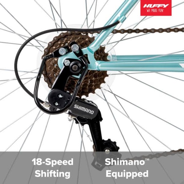 Huffy 26 Rock Creek 18-Speed MTB The Huffy Rock Creek 26-inch Mountain Bike in light sea crystal blue combines a hardtail frame, great style and the right specs to have a blast over bumps on paved trails or rides around the neighborhood. Smooth 18-speed index shifting system with a Shimano rear indexed derailleur consistently shifts between gears for quick adjustments venturing uphill or accelerating on level ground. Plus, the front suspension fork responds as you ride for better control over curbs, potholes, and branches. The slim ATB saddle includes an alloy quick-release seat binder for easy adjustments to the right height, or to simply remove when needed. Kraton MTB grips add comfort for a great hold while you enjoy the great ride of the Huffy Rock Creek. From Huffy.
