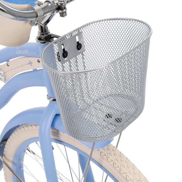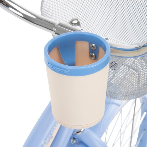 Deluxe Womens Cruiser Bike 24 bicycles are designed for ages 12 to 19 or a rider height of 58 to 70 inches. This comfortable single-speed cruiser bike features light blue paint white tires handlebar basket and rear rack drink holder and a dual-spring padded saddle. Huffy’s Perfect Fit Frame and adjustable seat height ensure a comfortable riding position every time. Specifications. Color: Blue