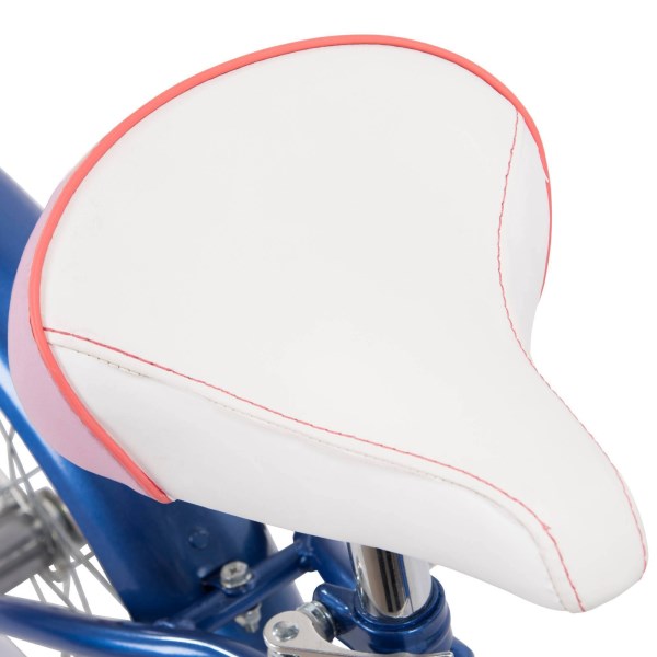This girl’s cruiser bike has 20 inch wheels and is designed to fit children between the ages of 5 to 9 years old with a maximum weight of 90 pounds. This stylish cruiser features a blue frame with pink accents on the wheel rims and handlebar grips. White wall tires complete the classic cruiser look. Features. Comfortable Huffy CRUZFIT frame combines fun cruiser style with great fit. Deluxe spring saddle features contrast piping and embroidery for a total fashion look that’ s comfortable to ride. Dual density grips and pedals feel comfortable from the first touch until the end of the ride. Alloy quick release ensures easy height adjustments for a great fit as kids grow. Flared fenders with durable braces maintain a classic look and keep water away during ridesSpecifications. Color: Purple.