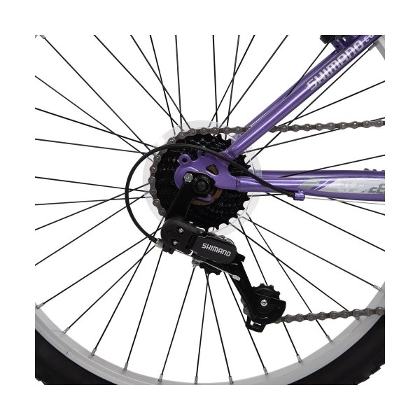 ountain Bike has the style and the performance to hit bike trails for spirited riding adventures. With the SHIMANO rear indexed derailleur, twist shifting delivers 21 speeds with ease to accelerate on level ground, to climb hills, and to glide down slopes. Stitched for quality, stitched to last, the ATB saddle is padded for comfort. The alloy quick-release and railing make it simple to adjust the seat to the right height and angle. Alloy wheel rims are brushed to enable smooth brakepad contact for consistent, stopping action from the front and rear linear pull brakes. The Kolo 1200 front suspension fork absorbs stress from bumps and unexpected dips for a more responsive ride. Knobby 24” x 1.95” tires grip the terrain for excellent performance in wet or dry conditions. Highland glows purple for a stylish look, and delivers the riding euphoria you crave for bike trails, gravel paths, and even paved roads in the neighborhood. Kickstand included, for when you need to take a pause from the riding fury. For ages 12 and up.