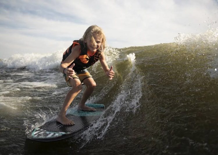 Get your kids in the wave and share the thrill of Wakesurfing! Kid’s Unite behind the boat, this time while Wakesurfing with Hyperlite’s new Gromcast. Spawned from the Broadcast series, the Gromcast is an easy to surf fun shape for all kids to enjoy. The wide profile provides the needed surface area but the Gromcast is short and easily maneuverable so kids can begin learning power carves and spins. Customize the ride with 3 removable fin options and relax on the cushy comfy EVA traction pad. Don’t make your groms ride a plank, get them on the Gromcast so you can sit back and watch them shred.