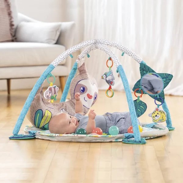 Babies will love this improved transforming 4-in-1 Jumbo activity Gym & ball pit. This unique gym converts into a fun, sensory-stimulating oversized ball pit that’s perfect for busy toddlers. When the fun is done, store the included colourful balls conveniently in the Sloth shaped body.