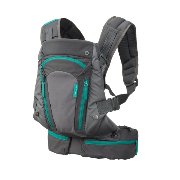 Keep your baby close while on the go. Padded shoulder straps and supportive waist belt evenly distributes weight. Weight belt length adjusts from 39″ – 55″. 4 Ways to carry children facing in (reduced width seat) facing-in (expanded seat) facing out and back pack. Able to hold babies from 8-40 lbs. Cinch seat narrows for infants and expands for older babies. 6 Intuitive pockets that expand outward and not in towards the child allowing for easy access. Includes a removeable silicone teether and a soft muslin hood.