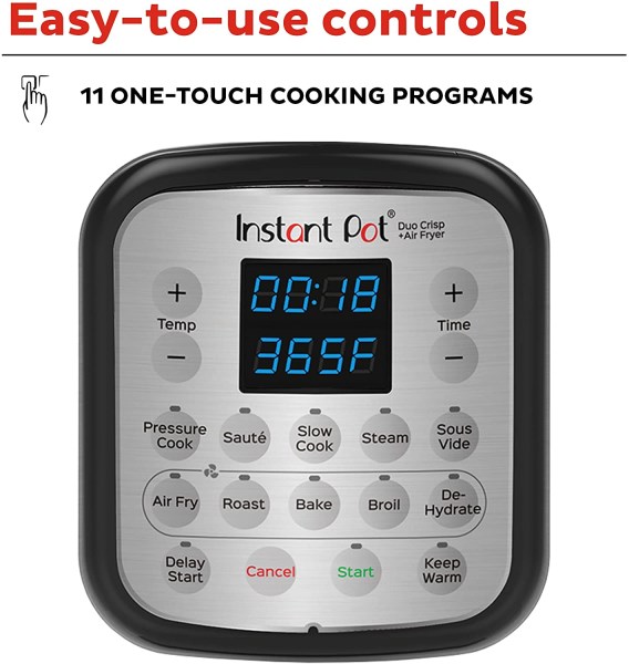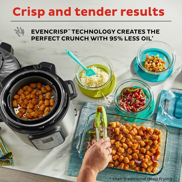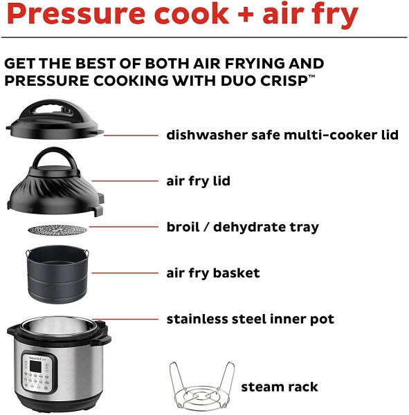 From the makers of the Instant Pot Duo series comes a pressure cooker with air frying capabilities. Pressure cook delicious one-pot meals up to 70% faster than traditional cooking methods, slow-cook foods to tender perfection just like grandma used to make and get all the crunch from deep-frying but with 95% less oil in one multi-cooker. Seamlessly transition from pressure cooking and slow cooking to air frying with the included removable air fryer lid. With 15 built-in smart programs, you can prepare even more of your favorite dishes with the press of a button. Redefine cooking and enjoy quick and easy meals anywhere, any time. The Instant Pot Duo Crisp offers the quality, convenience and versatility you’ve come to expect from Instant – discover amazing.