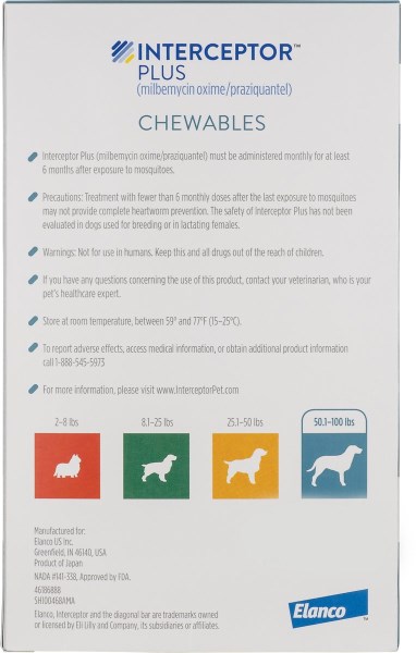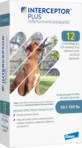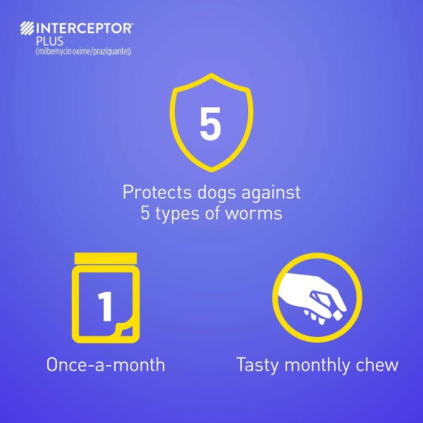 Interceptor Plus is a chicken-flavored chewable that kills the immature form of heartworm (Dirofilaria immitis). Interceptor Plus also treats and controls adult roundworms (Toxocara canis and Toxascaris leonina), hookworms (Ancylostoma caninum), whipworms (Trichuris vulpis), and tapeworms (Taenia pisiformis).