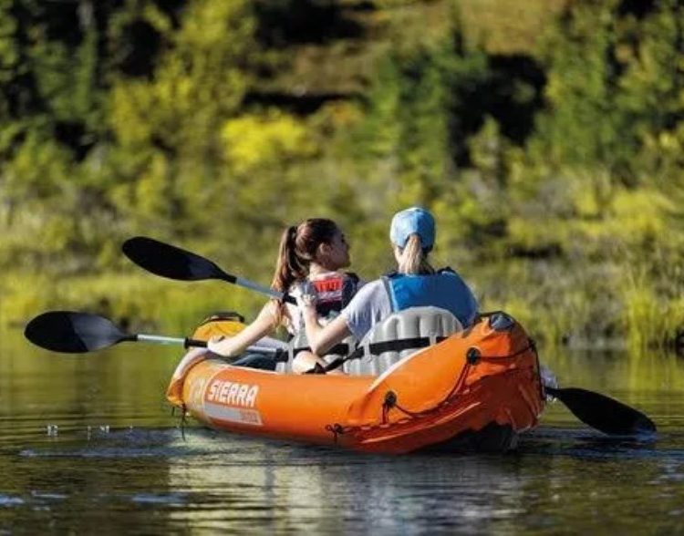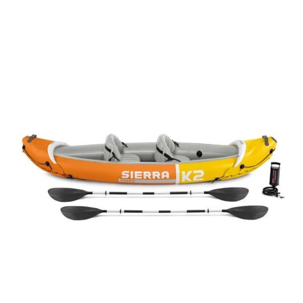 Get ready for an amazing day on the water with your friends and family with this Intex Sierra K2 Kayak. It’s sporty and fun and has a streamlined design for easy paddling, as well as a vinyl construction for strength and durability. The bright orange and yellow color make this inflatable kayak highly visible in the water. Ideal for experiencing lakes and mild rivers with a friend, it’s easy to assemble and ideal for two adults. This Intex Sierra K2 Kayak has an inflatable I-beam floor for stability, grab lines on both ends for safety, removable/adjustable seats and inflatable seats with a backrest. It also includes two 86 inch aluminum oars, a high output pump for quick and easy inflating and a repair patch for your convenience. This two-person kayak has a maximum weight capacity of 400 lbs, making it suitable for most individuals