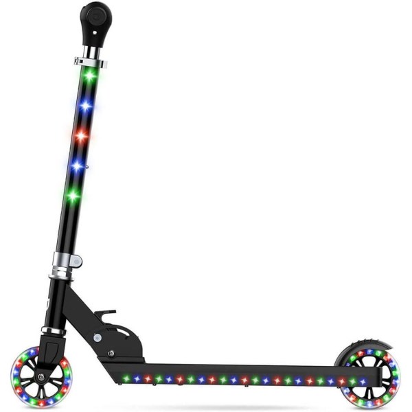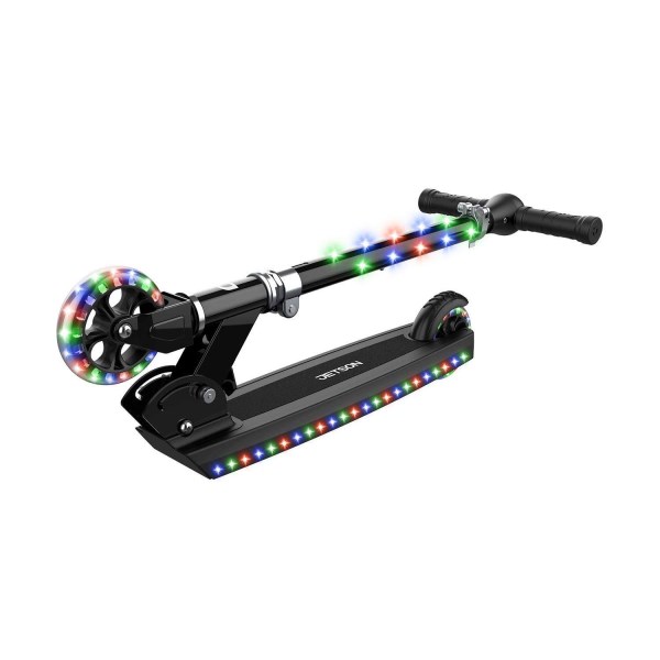 With over 100 LED lights on the handlebar stem, wheels, and deck, the Jetson Jupiter Folding Kick Scooter is sure to light the way for nonstop fun. The handlebar is height adjustable, so children can keep playing as they keep growing. Since safety is always top of mind, the Jupiter sports an easy to access rear fender foot brake, to ensure a secure, full stop every time. Easy Folding Mechanism. The easy folding mechanism located near the bottom of the stem makes it simple to fold the handlebar towards the deck and lock it into place. This easy folding design, along with a lightweight frame, makes the Jupiter a breeze to carry and store. LED Light-up Stem, Deck, and Wheels. The Jetson Jupiter features over 100 LED lights on the stem and deck that can be powered on or off and LED light-up wheels that turn on whenever they roll. Height Adjustable Handlebar. With a simple latch system, the handlebar can easily be moved up or down and quickly secured back in place ? so they can keep playing as they keep growing. Specifications: Brake: Rear foot brake. Steering: T-bar Wheels: 2 LED light-up wheels. Handlebar Height: Adjustable from 20″ to 29″. Deck Size: 17.25″ x 4″. Overall Dimensions: 25″L x 4″W x 24″H. Folded Dimensions: 25″ x 10″ x 9″. Weight: 6 lbs. Weight Limit: 132 lbs. Recommended Age: 5 and up.
