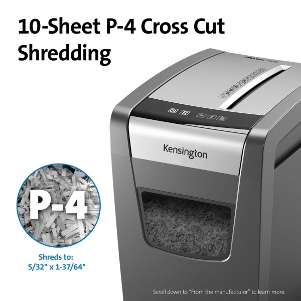 Crosscut shredder shreds up to 10 sheets at a time, including staples and paper clips. P4 shredding provides a high level of security for private documents. Anti-jam technology automatically stops and reverses the blades when too much paper is inserted, avoiding time-consuming and frustrating paper jams. A six-gallon/225-sheet bin with window helps shred more and empty less; The window makes it easy to know when the bin is full. Touch panel buttons deliver simple, intuitive operation.