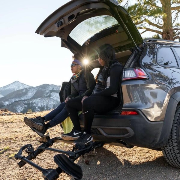 To get you and your riding mate to the post-ride noms faster, Kuat’s Transfer 2 Bike Rack nearly effortless drop and set loading feature is clutch when you are energy depleted from your epic ride. Roll up to the back of the car and kick down the spring-loaded foot pedal and lock the tray down for loading. The tire trays fit 20-29in tires, so there’s no hassling with initial positioning. A front claw-like lever arm holds the top of the wheel in place with PerfectFit adjustments, and a simple ratcheting strap secures the rear wheel in place.For heavier bikes, the U-Body design helps you step in closer to the rear tray without straining, unlike models that have a further outboard tray. And the Transfer 2 is Fat bike ready for the snow and beach adventure trips. If you want to add extra security to protect your bikes from opportunists, a locking hitch pin and integrated cable locks are purchasable separately.