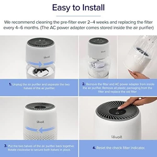 Breathe freely and sleep soundly with an air purifier that meets your needs. FEATURES: Refresh & Relax: I f you struggle with allergies, low-quality sleep, congestion, or symptoms caused by pet dander, the Levoit Core Mini Air Purifier is ready to help you create a healthy space Matter of Minutes: Breathe freely and sleep better as the air purifier uses 360° VortexAir Technology 3.0 and 3-stage filtration to ensure top-notch air purification Quiet Operation: Sleep soundly without loud rattling coming from your air purifier. This little air purifier keeps noise levels as low as 25dB while keeping your space fresh Aromatherapy: Struggling with pet odors or musty smells. Add a few drops of fragrant essential oils to the aroma pad to keep your space smelling great Save Space: Tired of dragging a bulky purifier back and forth. Light, travel-friendly, and compact, the Levoit Core Mini Air Purifier (6.5 × 6.5 × 10.4 in) easily fits in any bedroom, office, or living room, creating less clutter and more fresh air Travel Friendly: Take this air purifier around the globe and experience traveling without needing a transformer. The 100–240V~ 50/60Hz input design only requires an adapter (included inside the air purifier) One-Button Control: Tired of complicated machines. Cycle through 3 fan speeds, turn the air purifier On/Off, and reset the Check Filter Indicator with one simple button Fully Certified: Your concerns are our priorities. This air purifier is Energy Star and FCC certified, as well as ETL listed Genuine Levoit Filters: Only use genuine Levoit replacement parts to maintain the best performance (Search for Core Mini-RF or B09FK5PN4H). Off-brand filters are inconsistent, unreliable, and may damage the air purifier PRODUCT SPECIFICATIONS: Brand: Levoit Color: White/ Black Dimensions: 6.5 x 6.5 x 10.4 Inches Weight: 2.30 Pounds Filter Type: HEPA Power Adapter (Input): 100-240V/ 50-60 Hz Rated Power: 7W Noise Level: 25 – 44dB Coverage: 178 ft ? / 17 m ? 360° Air Intake: Yes WHAT’S INCLUDED: 1 x Air Purifier 1 x Pre-installed Filter 1 x Power Adapter (Included inside the air purifier) 1 x User Manual