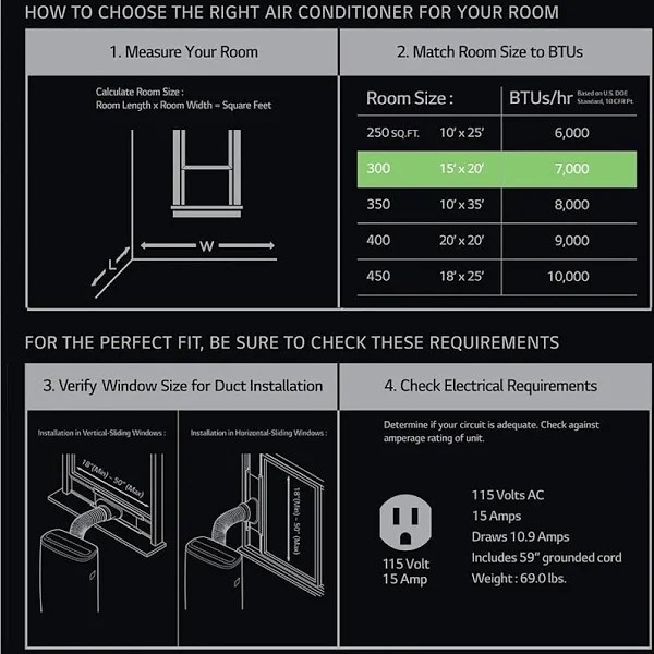LG 7,000 BTU Portable Air Conditioner This portable air conditioner is a great choice for versatile cooling! This quiet unit is ideal for cooling medium rooms up to 300 sq. ft. The unit has 2 cooling and fan speeds and a 24 hour timer to create a cooling schedule. The auto-swing air vent helps direct the flow of air where it’s needed most whether cooling, dehumidifying or just circulating air. If there is a power outage, the auto restart feature will automatically turn your unit back on when power is restored. Easy rolling casters allow you to efficiently move the unit to another location. Other features include an LCD remote control, easy window venting installation kit, removable/washable filter and a check filter alert.