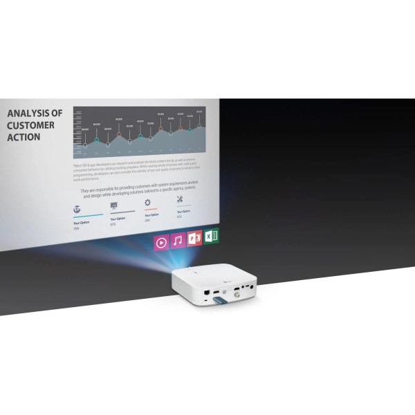 Watch movies and more in true 1080p high-definition sharpness, full of the fine detail that can be lost at lower resolutions. The picture remains lifelike and text is crystal-clear when displayed at up to 100 inches. Project your videos, photos and apps wirelessly from compatible smartphones, tablet or laptop. Pair big sound with the large-scale viewing via Bluetooth to compatible portable speakers, headphones or sound bars.