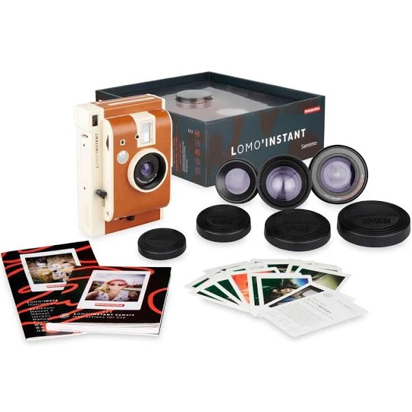 The Lomo Instant Sanremo edition is a retro chic instant camera which comes with three extra lens attachments so that you can stretch your creativity even further. Built in flash with Auto Mode plus manual flash on and flash off overides. The camera has a wide angle lens (27mm equivalent) built in plus comes with a fisheye lens attachment for a 170 degree viewpoint, a portrait lens attachment (35mm equivalent angle) and a close up lens for shooting as close as 10-15cm from your subject. B setting for shooting long exposures, night time shots, light streaks or light painting. Shoot unlimited multiple exposures. Comes complete with several coloured gels for use with the flash. Uses Fujifilm Instax Mini film (no film included).