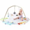 The Play Gym by Lovevery is the first to play gym for all your baby’s learning stages, providing what your baby wants to see, touch, and do as their little self starts to emerge. It includes everything you need from batting to teething to learning to focus–for your baby’s first year of play. A whole year of play in one box. For ages 0+, from infant to toddler Sustainably-sourced wooden legs for stability. 2 minute setup and takedown, no tools required. Five development zones on the baby Play Mat that reveals or conceal to prevent overstimulation and promote learning: Learning to focus; Making sounds; How things feel; Hiding and finding; Exploring colors. System of Black and White, Body, Object, and Mirror Cards that can be interchanged in the Learn to Focus zone. Baby-tested removable accessories for stage-based motor development: Organic Cotton High Contrast Montessori Ball, sustainably-sourced Wooden Batting Ring, and Organic Cotton Teether with BPA-free Silicone Ring. Converts to play fort with Play Space Cover for imaginative play. Play Guide with inspiration and activities from child development specialists. Learning Cards printed with soy ink Water-based non-toxic finishes. Teething toys made with 100% organic cotton Play Mat made with machine-washable polyester materials batch tested to be non-toxic and baby safe Plastic and silicone components manufactured without BPA and phthalates Product size (inches): 24h x 38w x 43l with mat zones closed; 24h x 50w x 47l with mat zones open.