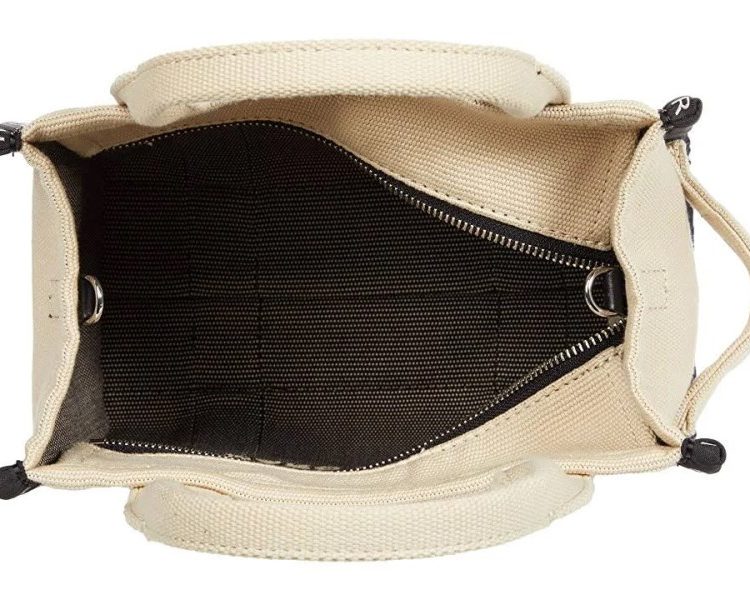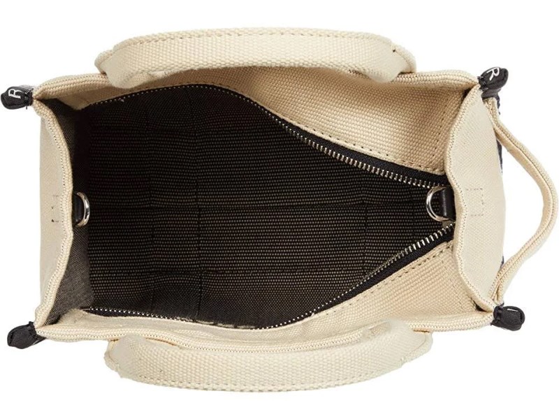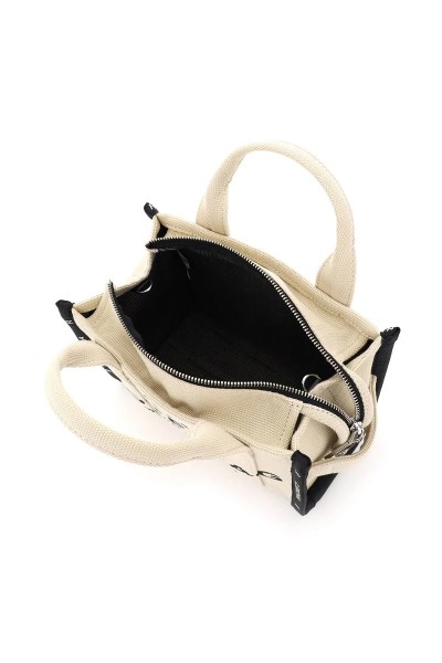 The Jacquard Traveler Tote Mini bag by Marc Jacobs in cotton canvas featuring double handle, ribbons applied on the edges, and jacquard embroidery with logo on the front. Removable and adjustable shoulder strap, logo patch applied on the back, top zip closure, side handle. Unlined interior, steel-finish metal hardware.