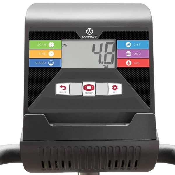 Looking for an easy and convenient way to lose unwanted pounds and increase cardiovascular endurance? The NS-40502R Marcy Recumbent Bike is the answer. Benefit from the same type of workout you would experience on larger and more expensive exercise bikes, but in a compact design. The eight levels of resistance are made to challenge you at every level in your fitness routine. With its foam covered ergonomic handles and adjustable foot pedal straps, you can workout comfortably and efficiently. The LCD computer screen displays time, speed, distance, calories, odometer, and scan-through of all 5 settings so you can keep track of your workout. This recumbent bike is designed with a step-through frame that makes getting on and off the bike much easier and the large padded seat means you can exercise more comfortably. Start your fitness journey with the Marcy Recumbent Bike.