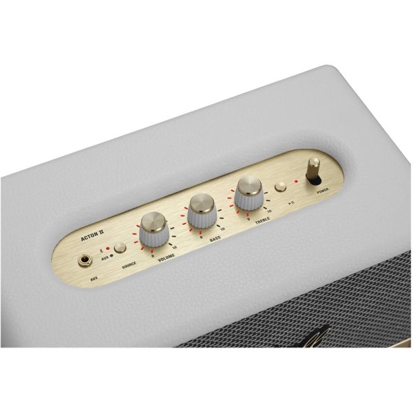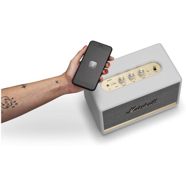 Marshall Acton II Voice Bluetooth Speaker features three dedicated class D amplifiers that power its dual tweeters and subwoofer, for large sound. Acton II is the smallest speaker in the Marshall line-up, but don’t let its size fool you. This dynamic compact speaker features three dedicated class D amplifiers that power its dual tweeters and subwoofer, for a sound that is nothing short of large. It produces a well-balanced, powerful audio experience, yet can fit in the tiniest of spaces. With Bluetooth 5.0 technology you can play your music in glorious, stereo sound with no wires required.