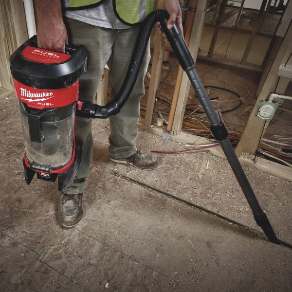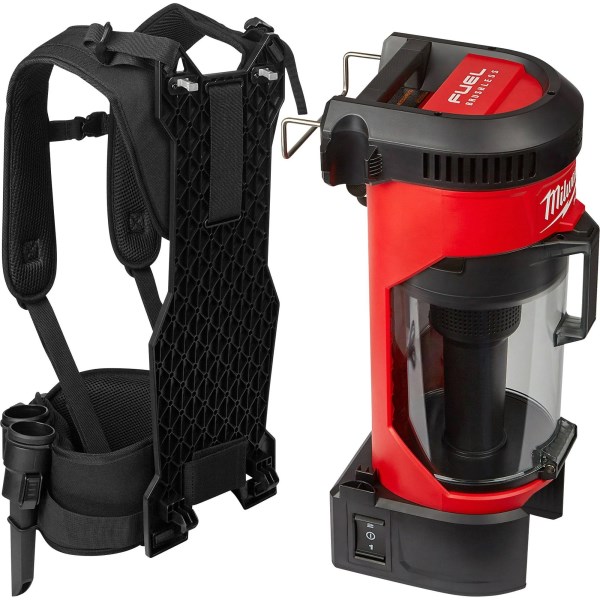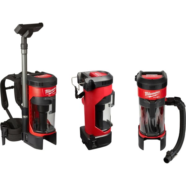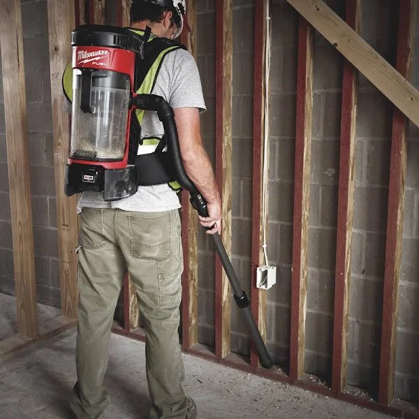 M18 Fuel 1 gal 18 V Cordless HEPA Backpack Vacuum Cleaner (0885-20) by Milwaukee. Whether taking on spot, area, or final cleanups, the Milwaukee M18 FUEL 3-in-1 Backpack Vacuum brings unmatched cordless performance, portability, and versatility to the jobsite. The POWERSTATE Brushless Motor and cyclonic design deliver up to 2X more suction power than traditional jobsite vacs, allowing users to efficiently tackle common jobsite debris like drywall dust, concrete dust, and wood/metal shavings. A removable harness, integrated canister hook and handle allow users to wear, hang, and carry the product for ultimate adaptability. Standard accessories include a flexible hose, telescoping extension wand, floor tool, crevice tool, HEPA filter, and dust extraction adapter. At only 76 dB(A), the vacuum is up to 3X quieter than traditional vacs, providing comfortable operation on any jobsite, including occupied spaces.