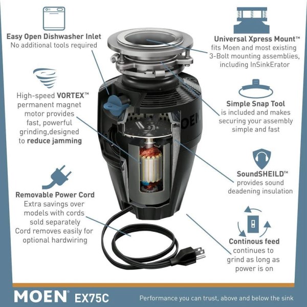 Disposal Description Part of the Moen Disposal Host Series: for advanced cleanup power. Includes enhanced features, powerful performance and and reliable functionality. Fast Track enhanced features for faster installation Simple Snap Tool quickly secures mounting assembly Easy Open Dishwasher Inlet: no tools required 3/4 Horsepower VORTEX Motor has powerful grinding capabilities to eliminate tough kitchen scraps. Motor technology designed to help reduce jamming Universal Xpress Mount fits all Moen and most existing 3-bolt mounting assemblies Pre-installed power cord – a savings over models where cord must be purchased separately, cord easily removes for optional hardwiring SoundSHIELD sound deadening insulation Compact design frees up space under the sink Manual Reset Button Garbage disposals reduce waste sent to landfills making it an eco-friendly option for your home Continuous feed with stainless steel turntable & galvanized grind components.