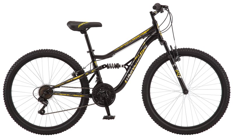 Mongoose brings its “push the limits” attitude to mountain bikes. The Standoff has a full suspension frame and front suspension fork so it will be comfortable chewing up rough terrain, and with 21 speeds and thick knobby tires nothing will stand in your way. Take it on the trail or adventure off the trail onto some gnarly single track. There is nothing you can’t do on a Mongoose. Product Highlights 26-inch wheels fit riders 5’4” to 6’2” in height. Full suspension frame maximizes comfort and performance Suspension fork smoothest bumps and increases control Twist shifters change gears easily 21 speeds twist shifters with a mountain bike rear derailleur are great for all types of riding. Linear pull brakes provide great braking power 3 piece crank offers wide gear range The manufacturer may substitute components with components of equal or greater performance level.?