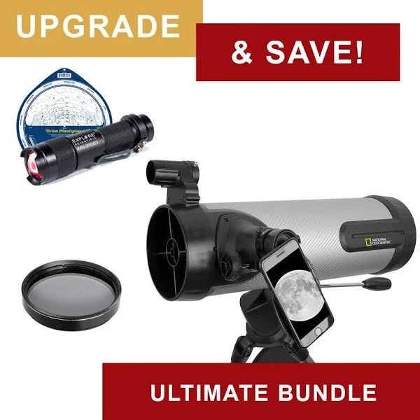 From our National Geographic series, the Explorer NT114CF Newtonian Astronomical Telescope is a perfect portal into the realm of deep sky observation. Offering a 114mm aperture and a 500mm focal length, the telescope comes with two Plossl eyepieces that produce images with excellent definition and contrast. The set also includes an adjustable tripod with pan and tilt control, a red dot viewfinder, a Smartphone Camera Adapter, a 2X Barlow lens, Stellarium computer software download and a star map. Just add clear, dark skies on a moonless night and a red flashlight to protect your night vision and you are set to explore the universe! Features : 114mm aperture has impressive light-gathering capability to provide excellent views of planets and bright deep sky objects. Fast focal ratio (f/5.2) shortens exposure times for deep sky photography. Pan and tilt control on alt-azimuth mount allows for smooth movements when navigating the night sky. Comes with two interchangeable Pl?ssl eyepieces and a 2x Barlow lens that provide magnifications ranging from 19x to 103x. Carbon fiber optical tube wrap assembly is lightweight but durable. Full size tripod includes accessory tray to keep eyepieces handy and provide additional stability. Included adapter helps observers use their smart device to capture and share images. Use the red dot viewfinder and downloadable astronomy software to locate observing targets.