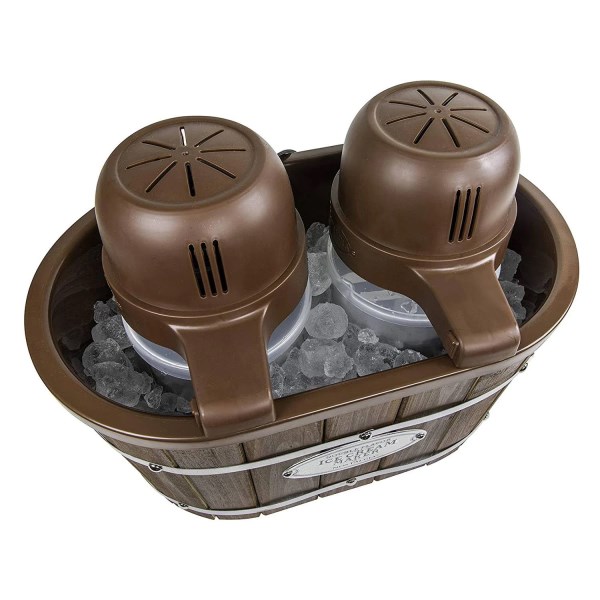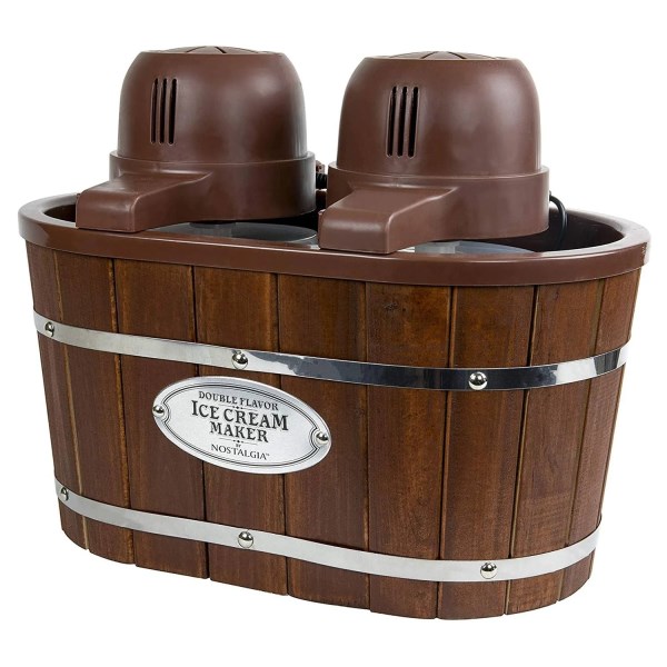 Nostalgia Bring the old fashioned ice cream shoppe right into your home! This real wood constructed unit includes two 2-quart aluminum canisters, allowing you to make two flavours of ice cream, gelato or frozen yogurt at the same time. Simply surround the aluminum canisters with ice and rock salt, then allow the electric motor to do all the churning. When compared to standard 4-quart ice cream makers, this unit makes ice cream 30% faster.