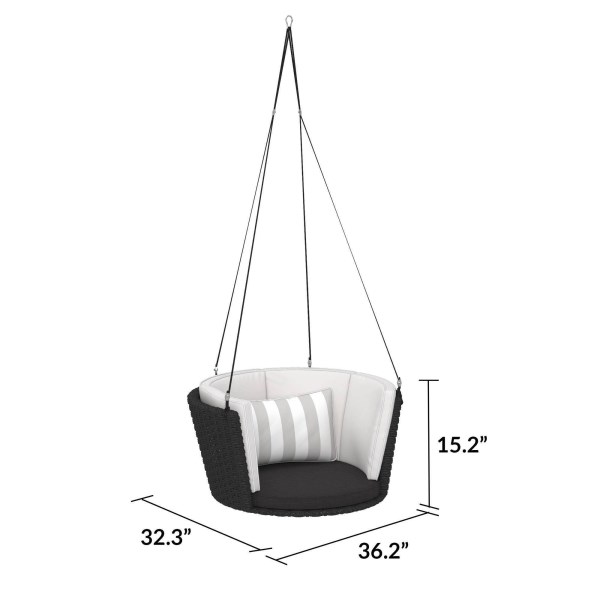 Sally loves hanging in the shade with a nice breeze and singing along to show tunes. This swing that goes both ways, is a showstopper with its rounded bottom, welcoming back and seat cushions, and open relationship status. The black resin wicker loveseat swing has comfortable thick black and white olefin cushions and a rosewater striped lumbar pillow. Swing includes heavy duty rope and 2 carabiners, literally making your favorite outdoor spot the best place to hang out in the neighborhood. With a 36 width and 250 lbs weight capacity, the swing is built for 1 but feel free to welcome your cat to hang with you! The durable swing will last for years in your favorite R&R spot inviting you to take a break every time you cross its path. Enjoy the charm of a gentle swing on a warm, sunny day and appreciate time that is free of the stress of the daily grind