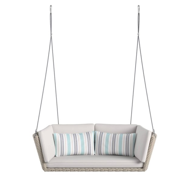 Sally loves hanging in the shade with a nice breeze and singing along to show tunes. This loveseat swing that goes both ways, is a show stopper with its rounded bottom, welcoming back and seat cushions, and open relationship status. Seats up to 2 comfortably. Built from durable, weather resistant steel and wrapped in wicker. Includes cushions and lumbar pillows.
