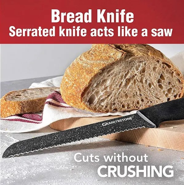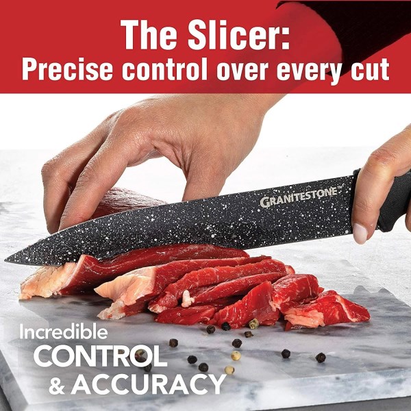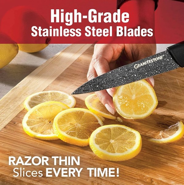 ULTRA NONSTICK GRANITESTONE COATING combined with the razor-sharp edges lets these knives glide right through all types of food without straining. Our Granitestone coating is mineral based and infused with diamonds and ensures the knives remain clean, resistant to rust and stains for years to come.RAZOR SHARP BLADES allows for easy and precise slicing and dicing from bread to cheeses, butter to vegetables, and fruits to meats & poultry.COMPLETE 6 PIECE KITCHEN SET includes a variety of knives for every job in the kitchen. Set contains; Santoku Knife for chopping dicing and mincing, Bread Knife for cutting all types of bread including soft bread without crushing it, Slicer Knife perfect for cutting slices of meats, poultry & fish, Ultra-Light Chef Knife designed to reduce drag while cutting delicate foodstuffs like butter, a Utility Knife for cutting cheeses, fruits and vegetables and a Paring Knife ideal for peeling or paring fruits and veggies or even removing seeds from a jalapeo. DISHWASHER SAFE these knives are dishwasher safe and nonstick for effortless care. Simply throw them in the dishwasher after use.