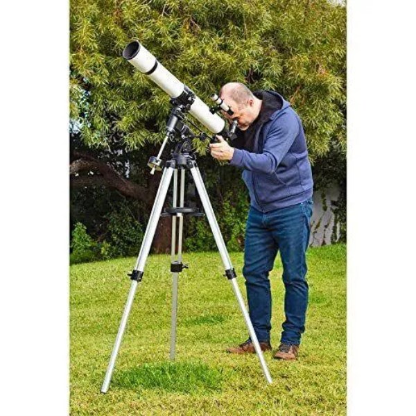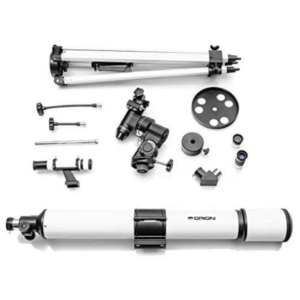 Orion Observer 90mm Equatorial Refractor Telescope This wonderfully capable equatorial refractor telescope gives beginning stargazers an exciting look at solar system favorites and beyond Its 90mm (3.5″) lens optics and 900mm focal length excel for stunning views of the lunar surface, Saturn’s rings, and bright deep-sky gems like Great Hercules Cluster The sturdy EQ3-class equatorial mount and aluminum tripod is a big upgrade from the mounts that comparable telescopes on the market come with Two quality 1.25″ Plossl eyepieces are included: a 25mm for low-power views at 36x, and a 10mm for getting in tight at 90x Highly portable: the optical tube can be removed from the mount quickly via the dovetail mounting system and carried separately. Beginning skywatchers looking for a low maintenance telescope that can serve up vivid, sharp images of the Moon, planets, and brighter deep-space objects need look no further than the Orion Observer 90mm Equatorial Refractor. A great telescope for the whole family, the Obser