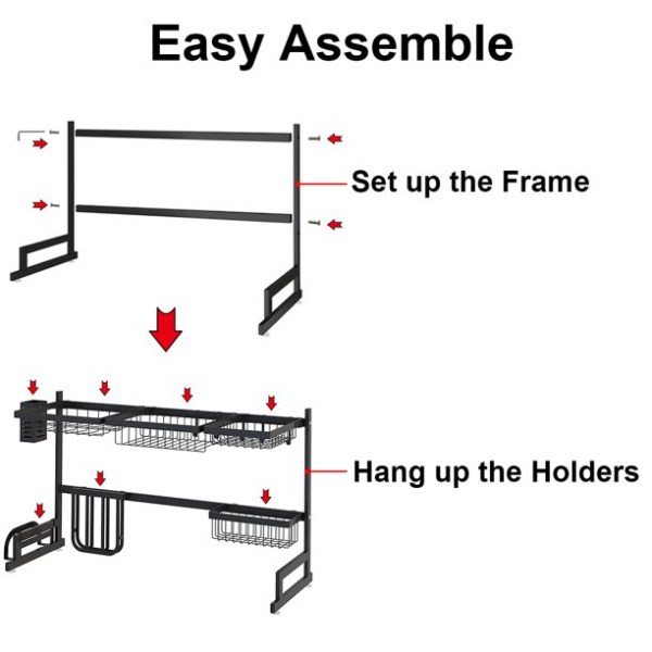 The dish organizer rack is easy to assemble for the accurate hole position. Let you easily access the utensils and supplies, water will drip into the kitchen sink rack directly. Make your kitchen cleaner and tidy also saves tons of space and time for you.