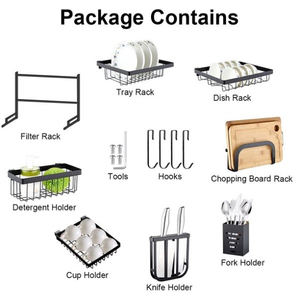 The multifunctional kitchen dish rack set includes tray rack, dish rack, cup holder, knife holder, chopping board rack(pot cover holder), fork holder(chopsticks cage), detergent holder and 4 hooks. All removable parts allow you to place the rack as you like. The stainless steel dish drying racks can also be used to store various kitchen utensils.