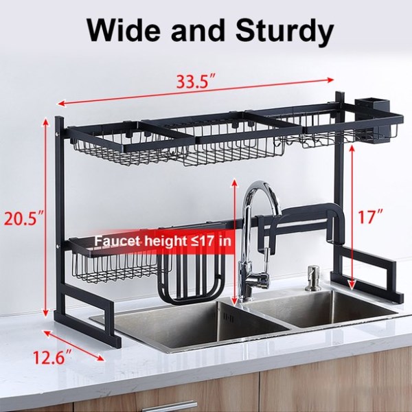 Over the sink dish drying rack is made of premium 304 stainless steel that is baking paint coating, features no rusting, long-lasting, durable and easy to clean. Premium stainless steel makes sure the rack shelf holds up to 90lbs.