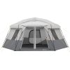 ” The Ozark Trail Hazel Creek 16-Person 3-Room Family Cabin Tent is a home away from home. Ideal for a family camp out with the kiddos or weekend away with friends, the 230 square feet of living space, 2 room dividers and a center height of 80 inches means there is plenty of space and privacy for everyone and their gear. This tent comfortably sleeps up to 16 people in up to 3 rooms and is full of all the creature comforts, including 3 E-Ports, a gear loft, a gear hammock, a media pocket and several organizer pockets to keep your tent tidy and your family organized. You can even enjoy a family movie night on a 55 in. (16:9) removable movie screen! Opting for an “”unplugged”” weekend? Remove the rain fly and enjoy the stars while the No-See-Um mesh protects you from even the tiniest of bugs. This tent stows away in an easy-to-carry expandable zippered duffle bag. The Ozark Trail Hazel Creek 16-Person 3-Room Family Cabin Tent makes the great outdoors feel like home. Ozark Trail Hazel Creek 16-Person 3-Room Family Cabin Tent: Features: Fits 4 queen air beds or 16 people in sleeping bags Two sewn-in room dividers provide added stability and allow you to separate the tent into 3 rooms Three doors make entrance and exit convenient Door flaps can be rolled back allowing the screen door to let air flow in while keeping bugs out An 80 in. center height provides cathedral ceilings for walk around room Removable fly with taped seams for weather protection Nine windows provide cross ventilation The windows of the tent zip up to provide extra privacy and protection from rain A mesh roof provides excellent star-gazing opportunities and extra ventilation No-See-Um mesh helps keep even the tiniest of bugs outside while you sleep An attached mud mat helps to keep the inside of your tent clean and dry Three E-ports for convenient electrical cord access next to each entrance of the tent A large movable Movie Screen and hanging media pocket to hold a tablet for viewing entertainment Pockets and gear hammocks keep your tent organized A clip-in gear loft keeps keys and other small items close at hand Reflective blue guy ropes for increased visibility Eight guy ropes provide stability Carry duffle expands to make repacking and storage easy Dimensions/Weight: Floor Dimensions: 22 ft. x 16 ft. Floor Area: 230 sq. ft. Center Height: 80 in. Packed Size: 28 in. x 12 in. x 12 in. Packaged Weight: 43.7 lbs. Specifications: Sleeping Capacity: 16 Tent Body Fabric: Poly Taffeta 185T 1200mm Floor Fabric: Poly Oxford 210D 1200mm Rainfly Fabric: Poly Taffeta 185T 1200mm Mesh Fabric: No-See-Um Carry Bag Fabric: Poly Oxford 210D Frame Material: Fiberglass and Steel poles Number of Seasons: 3 Number of Rooms: Up to 4 Number of Doors: 3 Number of Windows: 9 Number of E-ports: 3 Number of Movie Screens: 1 Number of Media Pockets: 1 Number of 3-Section Pockets: 6 Number of Wall Pockets: 4 Number of Gear Lofts: 1 Number of Gear Hammocks: 1 Number of Poles: 19 Number of Guy Ropes: 8 Number of Steel Stakes: 33 Tent Set-Up System: Pin & Ring Average Set-Up Time for 2 people: 20 minutes Additional Details: 1-Year Limited Warranty Assembly required. Instructions are sewn into the carry bag and can also be downloaded from the Manuals & Guides section below. For product questions or replacement parts, please contact our Customer Service Department at 1-833-908-2025 or email [email protected] Model No.: W959 Features: Expandable duffle, E-port, Media pocket, Storage pockets, 3 roomsBrand: Ozark TrailColor: Silver, Gray, BlueAssembled Product Weight: 43.7 lbManufacturer Part Number: W959Fabric Care Instructions: Spot clean with mild soap and water.Warranty information: One year Limited Warranty. Please contact our Customer Service Department at 1-833-908-2025 or email [email protected] for additional warranty information.WARNING – California Proposition 65: Cancer and Reproductive Harm – www.P65Warnings.ca.gov.Warehouse Number: WMWHN-518694841