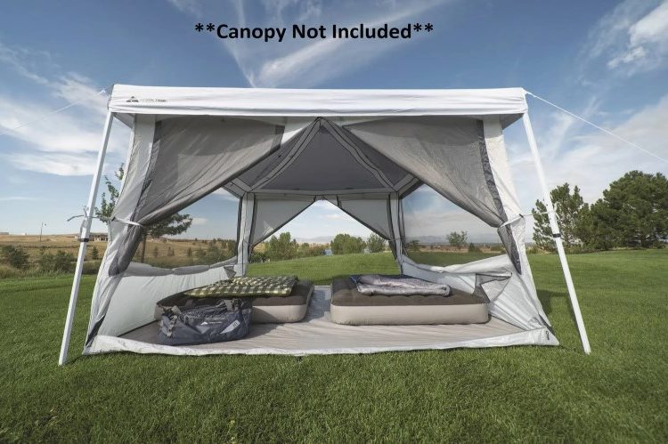 Lightweight The Ozark Trail 7-Person 2-in-1 Screenhouse ConnecTent is a versatile accessory for your 10 ft. x 10 ft. Straight-Leg Canopy. Simply clip it into your canopy (not included) to create a screenhouse or tent. It does not stand alone without a canopy. Two doors make entering and exiting easy for everyone. Six oversized windows provide plenty of ventilation and offer 360 degrees of visibility. A sewn-in floor keeps critters out while little ones play without getting itchy from the grass. The windows zip up for privacy and convert the screen house into a tent that is ideal for sleeping. This tent comfortably sleeps 7 people or fits 2 queen size air beds, making it more than just a screenhouse, but also an ideal camping accessory. An E-Port, media pocket, 4 lantern loops, and storage pockets ensure you enjoy all the comforts of home. The Ozark Trail 7-Person 2-in-1 Screenhouse ConnecTent is the go-to canopy accessory for camping and backyard fun. *10×10 Straight-Leg Canopy Sold Separately* Ozark Trail 7