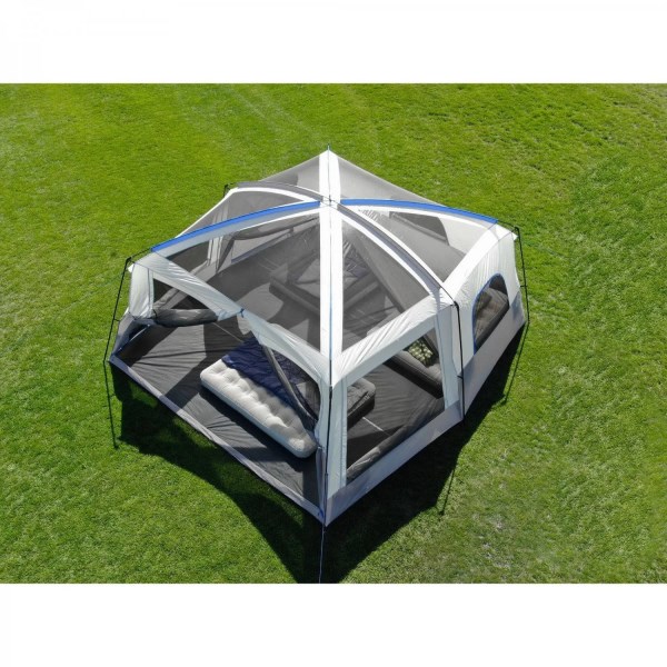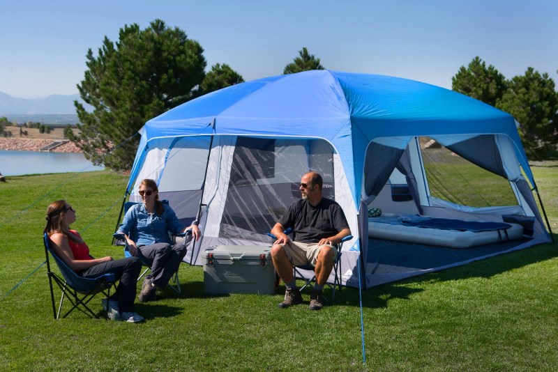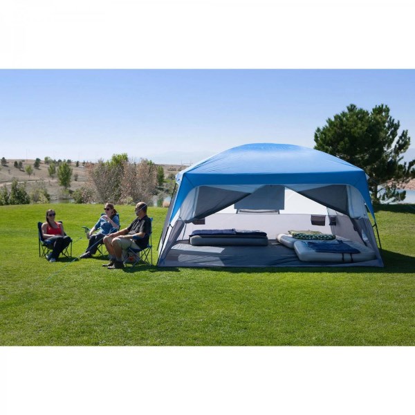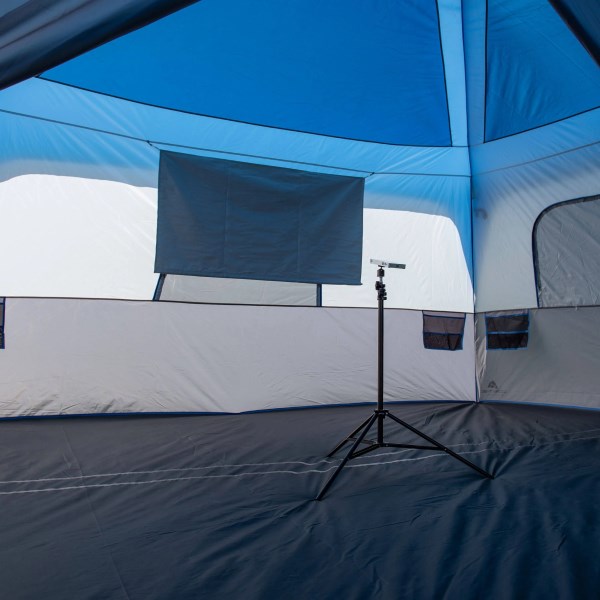 The Ozark Trail Hazel Creek 14 Person Family Cabin Tent is a spacious home away from home when camping. This 15 x 15 tent is perfect for a family camp out with the kiddos or weekend away with friends and includes a 92 center height so that even your tallest family member can stand up. The 210 square feet of living space and sewn-in room divider means you can easily create two separate rooms for up to 14 people or have a separate sleeping area from your living area. On clear nights, remove the rain fly to enjoy a night under thes while the No-See-Um mesh keeps the bugs out. This tent is full of all the creature comforts, including 2 E-Ports, a media pocket, and many organizer pockets to keep your tent tidy and your family organized. You can even enjoy a family movie night on a 48 x 27 movie screen to wind down after a day of outdoor fun. This Ozark Trail Hazel Creek 14 Person Family Cabin Tent comes in an easy-to-carry expandable zippered duffle and is the perfect choice for your familys next outdoor adventure.