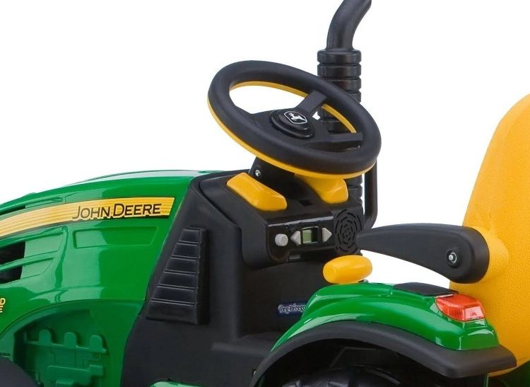 John Deere Ground Force takes outdoor play excitement to the next level. Kids will delight in listening to the FM radio while driving the large John Deere Ground Force Tractor with full-size detachable trailer. 2 to 7 year olds will load up the extra large trailer and deliver their payload. The adjustable seat also has flip-up armrests. 2-Speeds, 2-1/4 or 4-1/2 miles per hour, plus reverse, automatic brakes and 4WD farm tractor wheels make driving a breeze. Parents control the speed with the 2nd gear lockout feature. 12-volt rechargeable battery and charger included. Made in USA in our Fort Wayne, Indiana factory using domestic and global components.