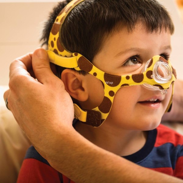 The New Pediatric Wisp Nasal interface Fit Pack Kit is designed just for children. The interface is designed to fit the size and shape of a child’s face, with 3 different cushion sizes. The colorful giraffe fabric pattern helps your child ease into therapy.
