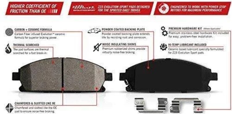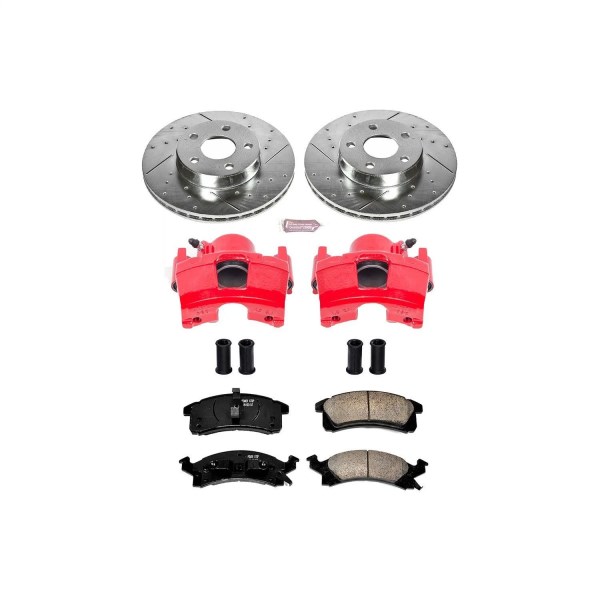 Power Stop Z23 Evolution brake upgrade kit with calipers makes it simple and cost effecient to increase the braking power of your daily-driver. This Power Stop kit is engineered to provide a low dust and noise-free upgrade over your stock brake system. The Power Stop Z23 brake upgrade kit makes it simple to complete your brake job by including everything you need: perfectly matched drilled and slotted rotors, Z23 Evolution carbon-fiber ceramic brake pads, upgraded hardware, and high performance lubricant. The low-dust ceramic formula brake pads are reinforced with carbon fibers to strengthen the compound. This brake kit is dust free, noise-free, and will give you increased braking power without sacrificing everyday drivability. The rotors are cast using the finest G3000 metallurgy with strict OE tolerances – making them a perfect, bolt-on upgrade without the need to make any modifications. Precision drill holes allow for maximum rotor cooling. This keeps the temperature of your brakes down during extreme operating conditions. Rounded slots help wipe away any gas or debris – keeping a clear contact patch on the rotor surface for safe, smooth braking. Silver Zinc Dichromate plating is applied to all drilled And slotted rotors, they not only look great behind your wheels, but help to prevent rust and corrosion. The brake calipers are coated with easy to clean powder coating which helps to resist rust and corrosion and extend the life of the calipers. The red is a nice touch and really stands out behind your wheels! Get your brakes done right with Power Stops Z23 Evolution Sport brake kit.