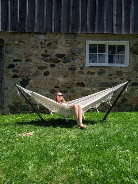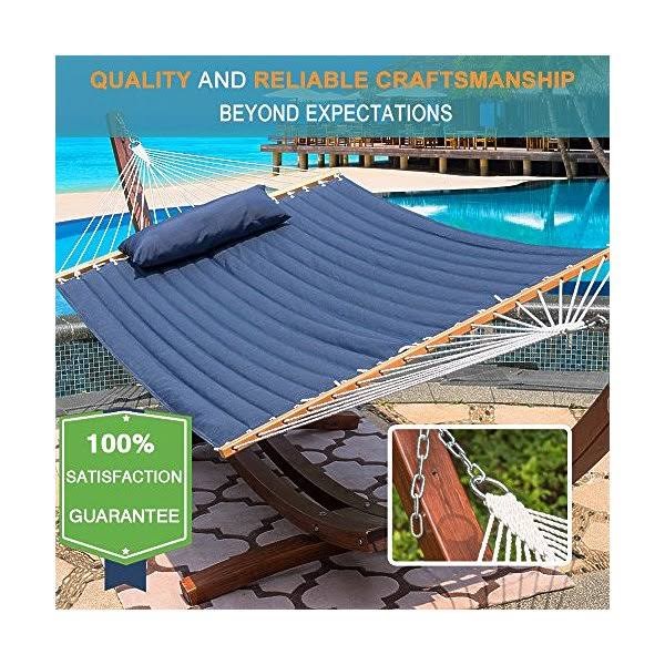 The double-layered quilted polyester with inner polyester padding and a polyethylene stuffing head pillow offer superior comfort. – Handcrafted polyester ropes add character and authenticity, thickness of the end cords, and perfect connection of steel chain and O-ring contribute greatly to the balance and strength of the hammock.55 inches durable Hardwood spreader bar with powder coated in an oil rubbed finish protects from rot, mold or mildew, making it more stable and stylish as well as maximizing style. – Bed dimensions: 78 x 55 inches (overall length: 141 inches); Support up to 450 pounds. – NOTE: Stand sold separately. – Search ASIN B01CS4FRLM for steel hammock stand and ASIN B01N0RU371 for wooden arc hammock stand, ASIN B077FZW6NV for Hammock Straps.