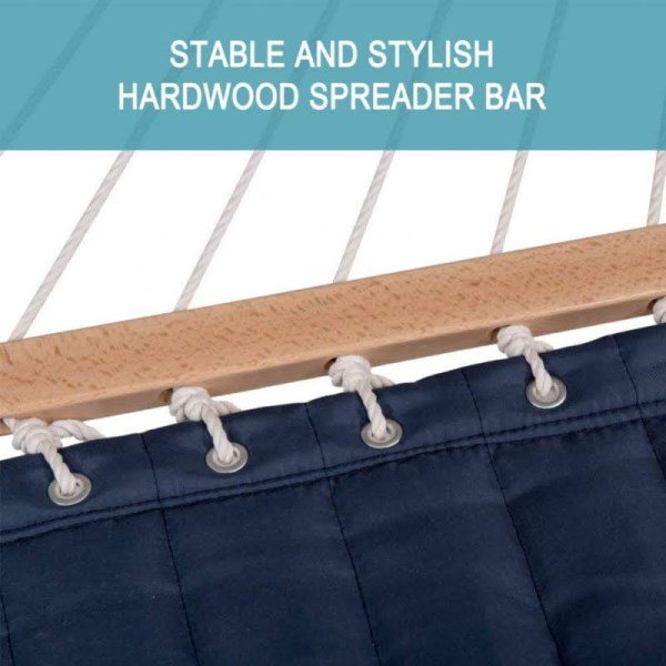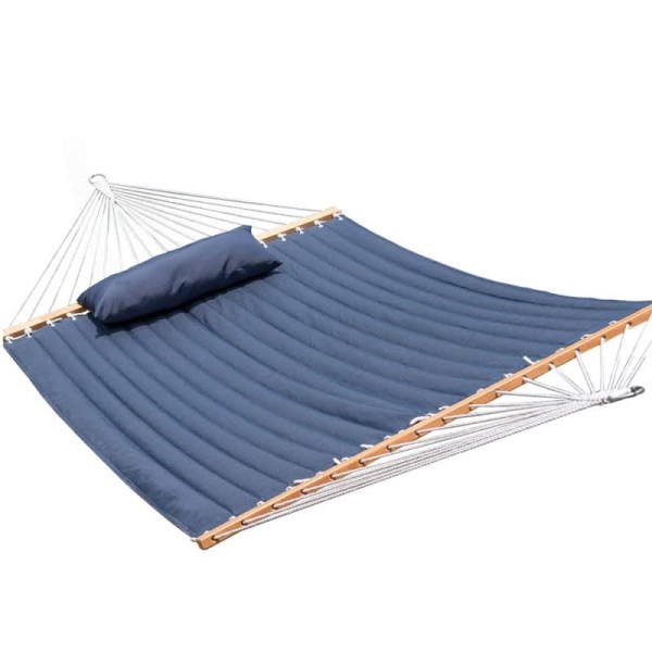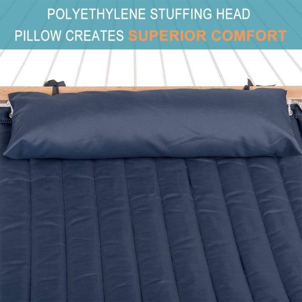 Quilted Fabric Camping Hammock with Pillow Double Size Spreader Bar Blue
