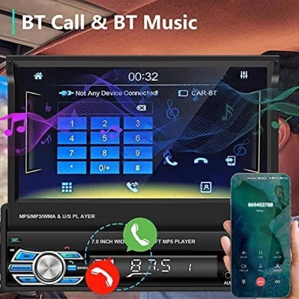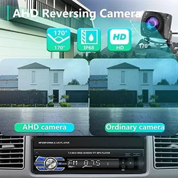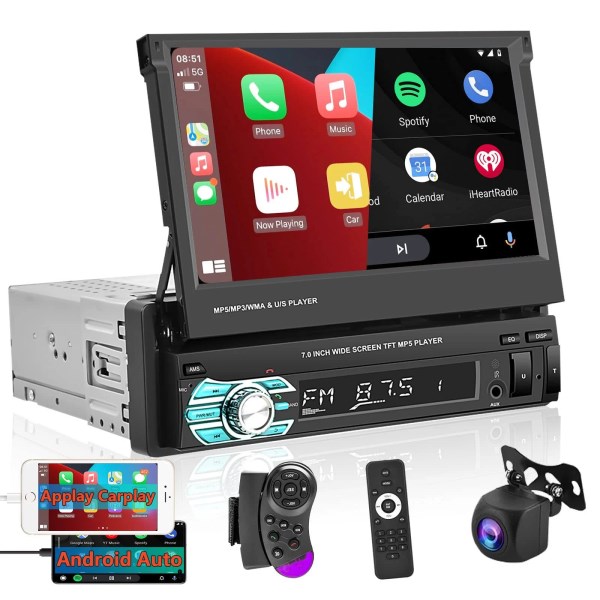 Car Stereo with Carplay Android auto Functions 7 Inch Foldable Capacitive Touch Screen Radio Supports FM Bluetooth Mirror Link SWC,Single Din Car Audio with AHD Backup Camera/USB /TF Card Port/AUX-in 【Carplay & Android auto Functions】This car radio support carplay and android auto functions. – Only connect with mobile phone via USB data cable,then you can access mobile phone contacts, email, notification, map navigation, music, video and other information, and also implement voice control.( Suitable for Android 11/ IOS 11 and below) 【Mirror Link】Supports Android (4.0-9.0) two-way connection, IOS(12 and below) one-way projection to the car headunit. You can watch the video on the stereo after connection. – You can cast all the functions which you want on your phone to this audio’s screen. – Very convenient! 【Foldable Single Din Car Stereo】Szie:187(L)*57(H)*152(W) mm,HD digital LCD folding touch screen, manual flip out the screen, support TF card and AUX input, high-speed USB2.0 interface is compatible with a variety of U disk, removable hard drive, hot-swappable. 【Built-in Bluetooth & FM】Built-in Bluetooth,you can receive and make hands-free calls without being disturbed while driving, and play Bluetooth music, which greatly improves your safety during driving. – With FM 18 preset stations, which can search channels automatically. 【Backup Camera Input & SWC】This car receiver with an AHD waterproof camera. – Reverse image will be displayed on the screen automatically when you are reversing. – Support steering wheel button learning function, through it you can control the functions that you need by steering wheel. “