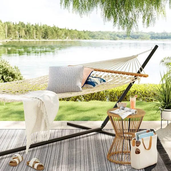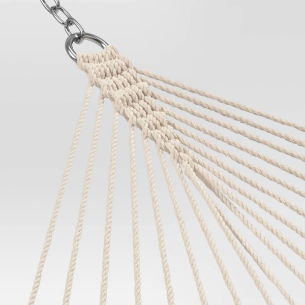Create a comfortable and inviting outdoor space by upgrading your seating options with this Rope Hammock with Spreader Bar from Threshold . This classic outdoor hammock is made with a woven rope design that creates comfortable support when you’re laying down and relaxing. It has study wooden spreader bars on either side with rope woven through that meets at a circular metal ring and chain for secure and easy hanging. Whether you’re attaching it to a stand or to two trees, this classic rope hammock is a great way to kick back and enjoy the great outdoors. Pattern: Solid.