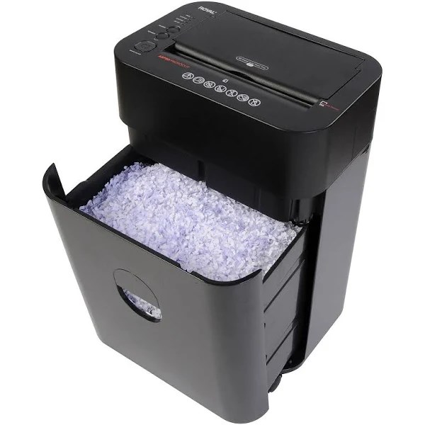 The Royal ASF80 Micro-Cut Shredder is the next level in document security. What makes this unit really stand apart from other shredders is the auto-feed feature. Just turn on the ASF80, lift-up the auto-feed tray and load up to 80 sheets of standard 20 lb. bond paper into the tray and walk away. The ASF80 does the rest. Using four small rubber rollers, the unit will carefully grab each individual sheet and direct it into the shredding slot to be destroyed. This is very much like the way your laser printer or copier feeds paper to be printed. The photo sensor starts the shredding process and turns off the shredder once it has completed its task. Two lift-up access doors allow you to safely clear any paper jams, if they should occur. You can also manually shred additional sheets or credit cards through the manual 8 7/8” shredder slot while the ASF80 is in the auto-feed cycle. You can also manually feed up to 8 sheets of 20 lb. bond paper in a single pass for those smaller everyday jobs. In either manual or auto feed, the powerful .84 HP AC motor easily shreds those documents into tiny 4mm x 12mm unreadable pieces. Credit cards are quickly destroyed as well through the same paper slot. The easy-to-use control panel is located on the top of the shredder with clear access to the power on/off, forward and reverses switches. Also on the top panel are LED lights indicating power ready, overheat, overload and bin full information. Royal provides a large 4.5-gallon pullout waste bin to store the shreds until you are ready to discard them. An LED sensor will light when the waste bin is ready to be emptied or you can view the shreds through the clear viewing window located in the center of the waste bin. The ASF80 has a beautiful sturdy glossy-black cabinet that will give you years of dependable use. The ASF80 is a perfect workhorse for any small office, home, school or organization
