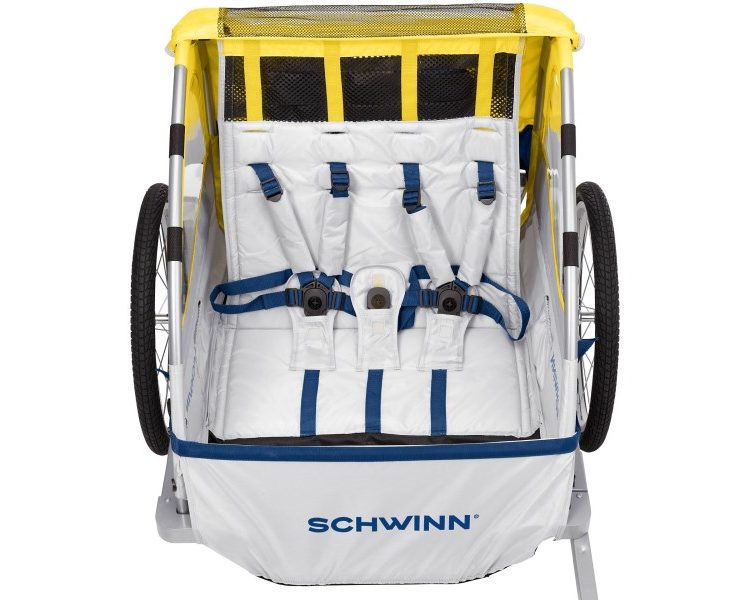 With the Schwinn Echo Double Bike Trailer, even your littlest kids can enjoy family rides in comfort and style. Kids ages 1 and up will enjoy a smooth journey via two 20 inch air-filled tires. You will appreciate your kids’ bike trailer’s rust-resistant aluminum-alloy frame and wheels because they make for light pulling, while kids will be glad there’s room for a buddy. Extra padding in the seats ensures kids stay comfy, while a five-point safety harness for each passenger keeps them well protected, too. The Schwinn Double Bike Trailer has a yellowithnavy design, which makes a visible safe choice for driving on the road, yet the color scheme is gender-neutral and stylish. The carriage also has mesh windows, so the kiddos get fresh air and stay engaged, as well as a roll-up shield to protect them when erratic weather hits. A universal coupler is included for attachment to your bike. When not in use, the Schwinn Echo Double Bike Trailer folds away so you can save space.