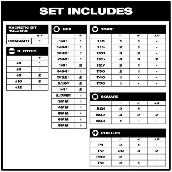 The bits feature Wear Guard Tip for increased wear resistance which protects the fit over the life of the bit. The impact driver bits have an optimized Shockzone for each tip type and length of driver bit to absorb peak torque and prevent breaking. The Custom Alloy76 Steel is customized and heat treated per tip type to extend the life of the driver but by up to 50X vs. competitive impact driver bits. The Milwaukee SHOCKWAVE Impact Driver bits are built to deliver users extreme durability for the most demanding applications. Wear Guard Tip protects fit over the life of the bit Optimized Shockzone absorbs peak torque and prevents breaking Custom Alloy76 Steel is engineered to extend bit life Precise Fit Custom Machined Tip prevents stripping and reduces wobble. Shockzones are optimized in both length and width per tip type for best performance across tip types. Laser hardening at the tip creates an outer protective shield for improved wear resistance. Customized geometry and heat treatment per tip type for best performance across tip types Up to 50X Life vs other impact bits Laser etched size for easy identification Designed for use with Impact Drivers and Drill Drivers. Kit Includes: (2) 1 in. P1, (20) 1 in. P2, (2) 1 in. P2R, (2) 1 in. P3, (2) 1 in. SQ1, (4) 1 in. SQ2, (1) 1 in. SQ3, (1) 1 in. T10, (2) 1 in. T15, (3) 1 in. T20, (4) 1 in. T25, (2) 1 in. T27, (2) 1 in. T30, (1) 1 in. T40, (1) 1 in. T50, (1) 1 in. SL #4, (1) 1 in. SL #6, (2) 1 in. SL #8, (2) 1 in. SL#10, (1) 1 in. SL#12, (1) 1 in. Hex 1/16 in. , (1) 1 in. Hex 5/64 in. , (1) 1 in. Hex 3/32 in. , (1) 1 in. Hex 7/64 in. , (2) 1 in. Hex 1/8 in. , (1) 1 in. Hex 9/64, (2) 1 in. Hex 5/32 in. , (2) 1 in. Hex 3/16 in. , (2) 1 in. Hex 1/4 in. , (1) 1 in. Hex 2.5MM, (1) 1 in. Hex 3MM, (1) 1 in. Hex 4MM, (1) 1 in. Hex 5MM, (1) 1 in. Hex 6MM, (1) 1 in. Hex 8MM, (1) 2 in. P1, (3) 2 in. P2, (1) 2 in. P3, (1) 2 in. SQ1, (2) 2 in. SQ2, (1) 2 in. T10, (1) 2 in. T15, (2) 2 in. T20, (3) 2 in. T25, (1) 2 in. T27, (1) 2 in. T30, (2) 3.5 in. P2, (2) 3.5 in. SQ2, (2) 3.5 in. T25, (1) Compact Magnetic bit holder