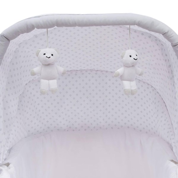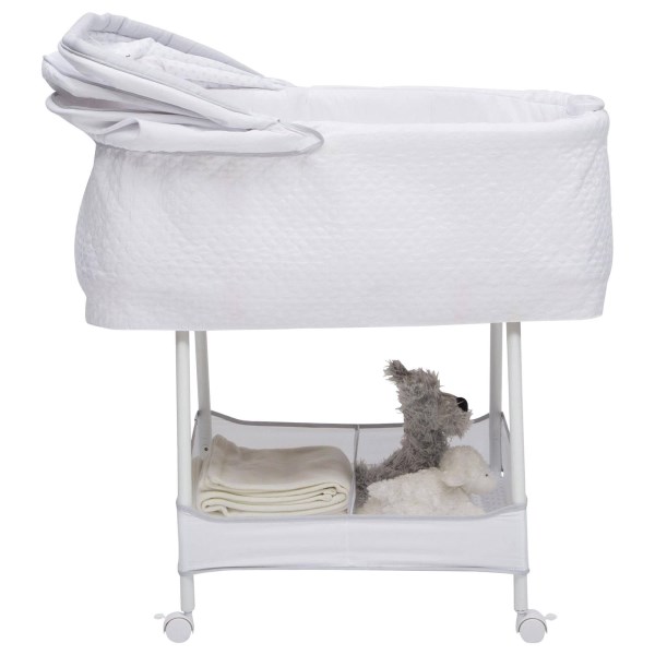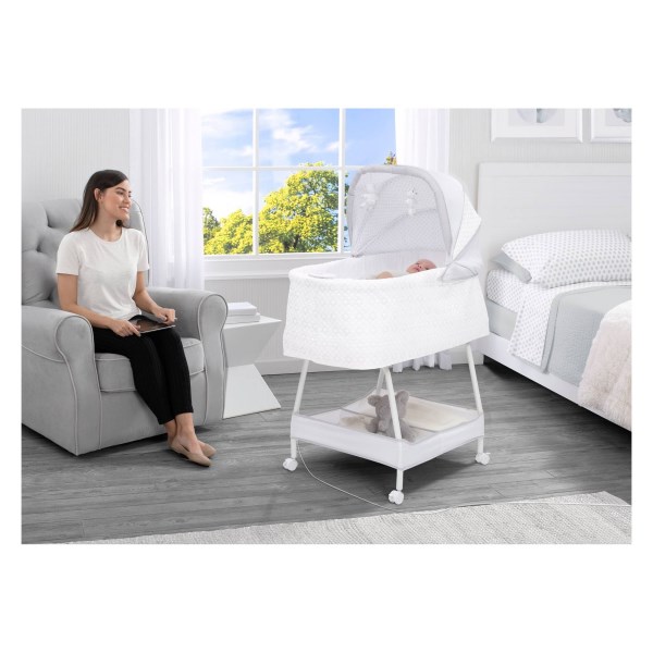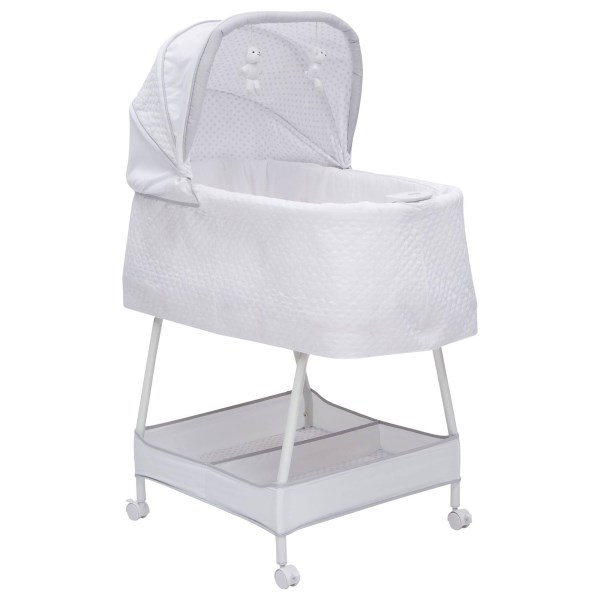 Lull your baby to sleep with the relaxing, automatic gliding movement of the Silent Auto Gliding Elite Bassinet from Simmons Kids. With a push of a button, the bassinet’s whisper-quiet gliding motion is activated, and the smooth sway of the bassinet will help your newborn drift to sleep peacefully. Outfitted with other electronic features that’ll help your little one power down, this bassinet for baby comes outfitted with a control panel at the front that plays calming music and features a soft-glowing nightlight. Captivating bears hang from the top of the canopy to engage Baby’s visual senses, and keep them entertained if they happen to wake before you. The bedside sleeper of your dreams, the Silent Auto Gliding Elite Bassinet from Simmons Kids has so many ways to soothe and comfort your little one during their first few months, helping both Baby and parent get a good night’s rest. The bassinet of your dreams, the Silent Auto Gliding Elite Bassinet from Simmons Kids allows you to feel close and connected to your little one in the safest way possible. This bassinet is rmended for babies 0-5 months. Stop use at 5 months or once your infant begins to push up on their hands and knees, whichever comes first.