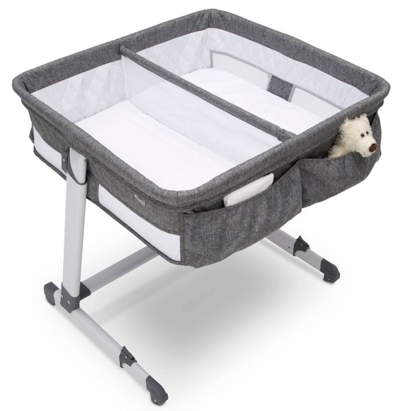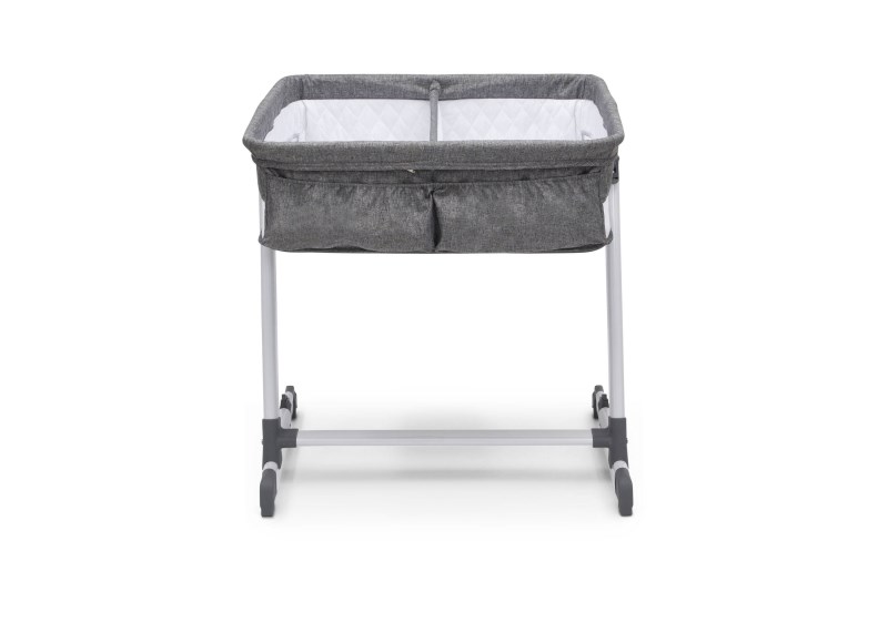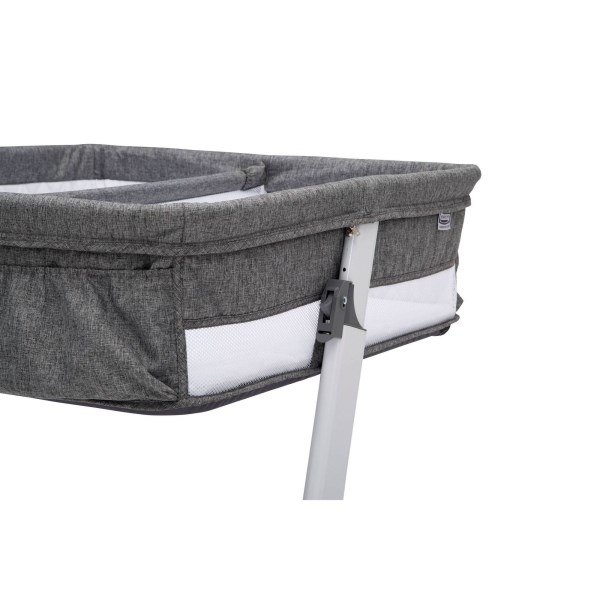 The bassinets modern z-shaped frame is outfitted with wheels, so you can easily slide the base under your bed giving your babies a safe, separate sleep space thats still close to you (and each other!). Perfect for all mothers (especially those who are breast feeding or recovering from C-sections), this bassinets sturdy, adjustable base with five height levels fits next to almost any bed, and keeps your baby at eye level, so you can easily soothe and tend to them during their first few months. Mesh sides provide a clear view and help with airflow. For your ease, storage pockets provide space for burp clothes, small toys or pacifiers. The twin bedside sleeper of your dreams, the Simmons Kids By the Bed Twin City Sleeper Bassinet allows you to feel close and connected to your little ones in the safest way possible. This bassinet is recommended for babies 0-5 months. Stop use at 5 months or once your infant begins to push up on their hands and knees, whichever comes first.